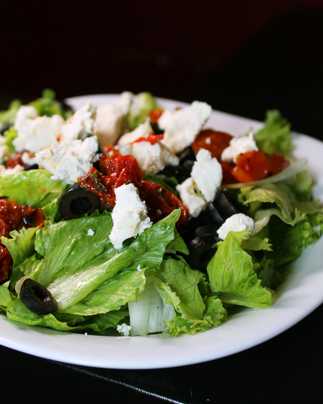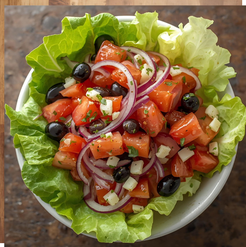 Lechuga, jitomate, cebolla, aceitunas negras y vinagreta