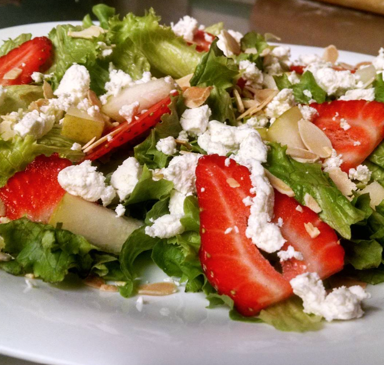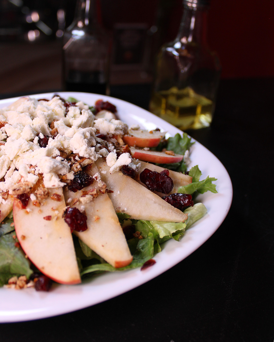 Manzana, arándano, queso de cabra, nuez garapiñada, lechuga y vinagre balsámico