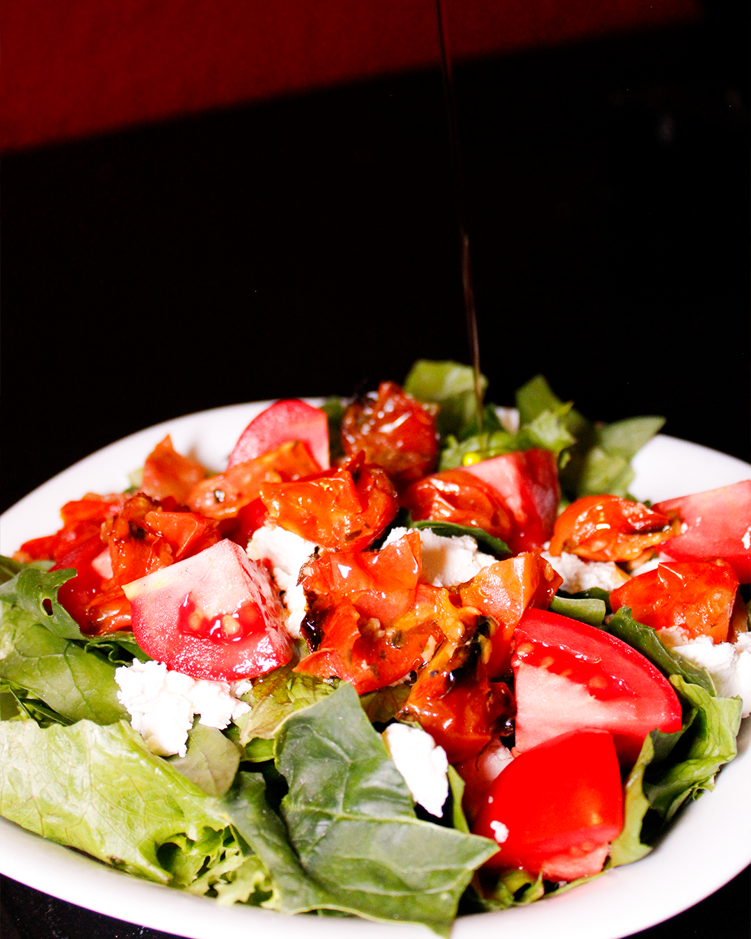 Lechuga, espinaca, jitomate cherry, jitomate rostizado, queso de cabra o manchego